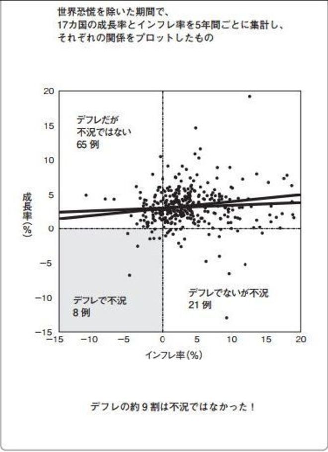 大恐慌以外のその他の時代をきちんと検証すれば、デフレと不況の関連性はまったくなく、デフレ期の90%近くは好況と重なっていたことが確認できるし、むしろ、インフレと不況の関連性のほうが高いという事実も認めざるをえないのです。