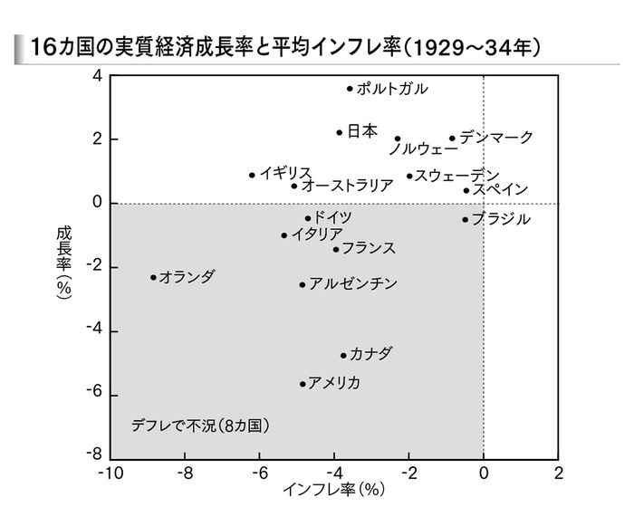 まず、上の図は何を表しているのかというと、1929年から1934年までの世界大恐慌時における主要16カ国の平均インフレ率と実質経済成長率をプロットしたものです。この図からわかるのは、世界大恐慌時には16カ国すべてがデフレを経験しましたが、そのうち8カ国が「デフレ」と「不況」を同時に経験し、残りの8カ国はデフレだけを経験していたということです。